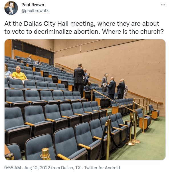 According to texascounties.net there were 2,336 churches in Dallas County in 2010. If one out of ten of every church in Dallas County sent just one representative each to stand up for the preborn, the Dallas City Council Chambers would have been quite literally overflowing with opposition.